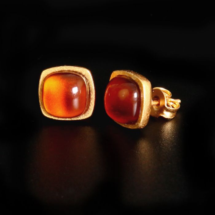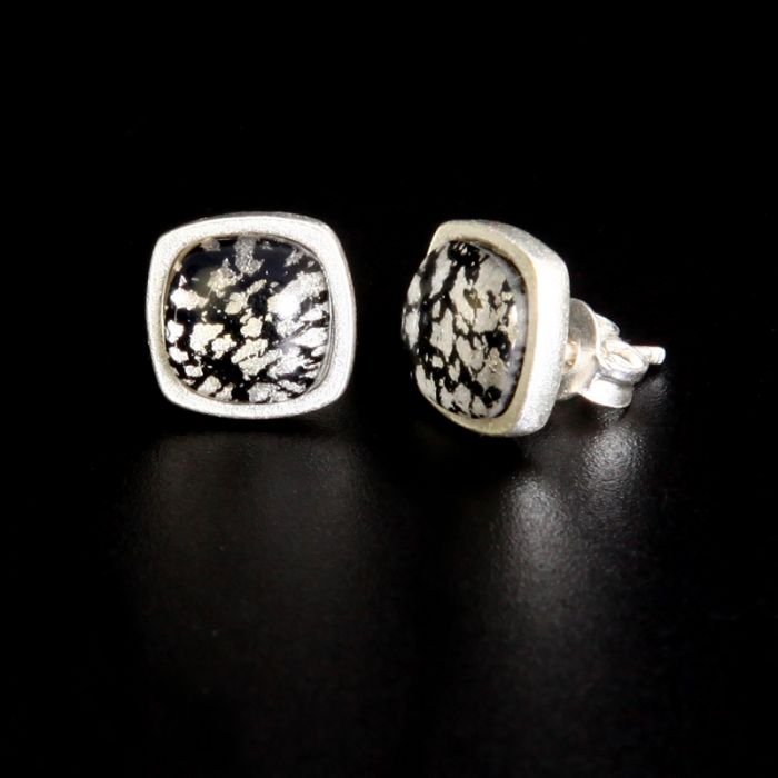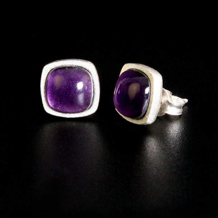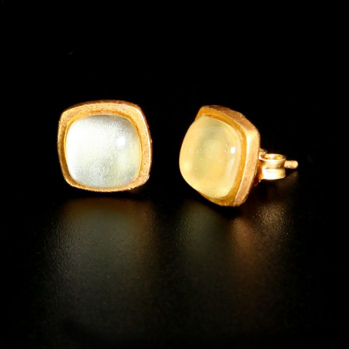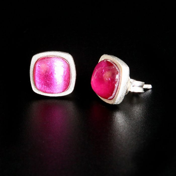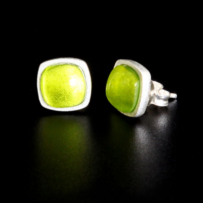 Ohrstecker viereckig mit abgerundeten Ecken, mit leuchtendem Glasstein, Durchmesser gesamt ca. 11 mm, Glasstein 8 mm, matt versilbert oder 22 Karat matt vergoldet, anlaufgeschützt,
