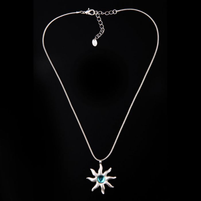 Kette mit sonnenförmigen Anhänger, mit leuchtendem Glasstein, Durchmesser gesamt ca. 25 mm, Glasstein 7 mm, Kette 40 cm + ca. 5 cm Verlängerungskettchen, matt versilbert, anlaufgeschützt