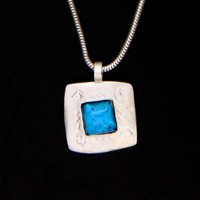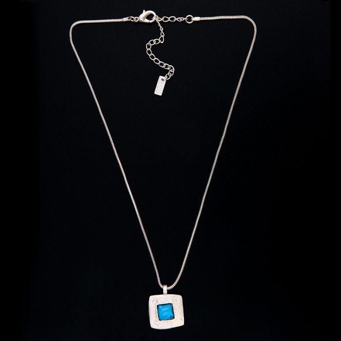 Viereckige Form, großer unregelmäßiger Rand mit Gravur, mit leuchtendem Glasstein, Durchmesser gesamt ca. 18x18 mm, Glasstein 8x8 mm, Kette 40 cm + ca. 5 cm Verlängerungskettchen, matt versilbert, anlaufgeschützt