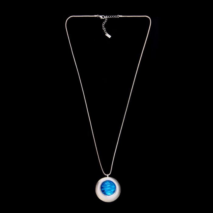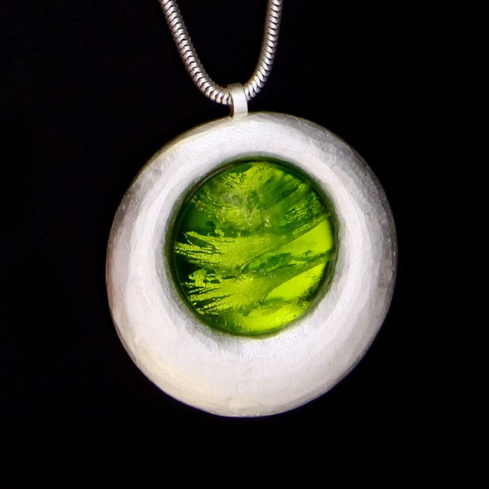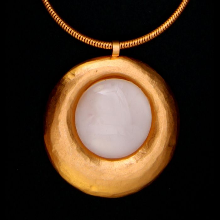 Rund, unregelmäßig gehämmerter Rand, mit leuchtendem Glasstein, Durchmesser gesamt ca. 45 mm, Glasstein 25 mm, Schlangenkette 70 cm lang + 5 cm Verlängerungskettchen, 22 Karat matt vergoldet, anlaufgeschützt