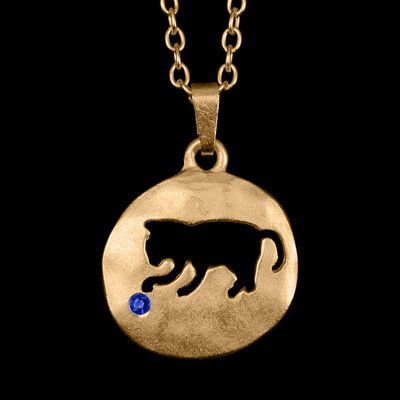 Kette Cat mattgold Kette mit rundem Anhänger ca. 20 mm Durchmesser mit ausgeschnittener Katze, die mit einem Ball aus einem glitzernden Glasstein spielt, feine Ankerkette, Länge ca. 42 cm, 22 Karat matt vergoldet, anlaufgeschützt auch in matt versilbert erhältlich s. separate Seite