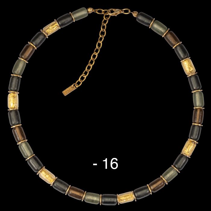 Collier mit einer wunderbaren Farbkombinationen aus grauen, braunen und goldenen Glaswalzen - in den goldenen Perlen ist echtes Blattgold verarbeitet - sowie kleinen vergoldeten Zwischenscheiben, Glasperlen 10x8 mm, Gesamtlänge 42 cm + 5 cm Verlängerungskettchen, 22 Karat matt vergoldet, anlaufgeschützt