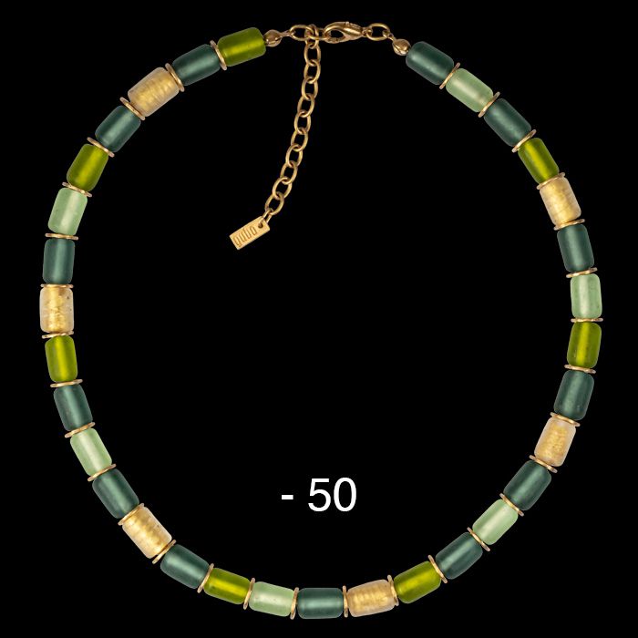 Collier mit einer wunderbaren Farbkombinationen aus türkisen, grünen und goldenen Glaswalzen - in den goldenen Perlen ist echtes Blattgold verarbeitet - sowie kleinen vergoldeten Zwischenscheiben, Glasperlen 10x8 mm, Gesamtlänge 42 cm + 5 cm Verlängerungskettchen, 22 Karat matt vergoldet, anlaufgeschützt