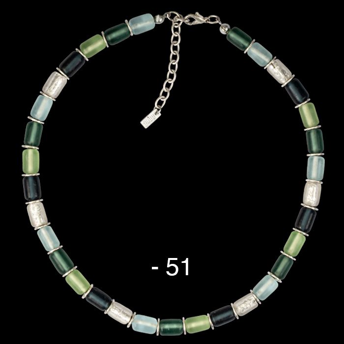 Collier mit einer wunderbaren Farbkombinationen aus grünen, blauen und silbernen Glaswalzen - in den silbernen Perlen ist echtes Blattsilber verarbeitet - sowie kleinen versilberte Zwischenscheiben, Glasperlen 10x8 mm, Gesamtlänge 42 cm + 5 cm Verlängerungskettchen, matt versilbert, anlaufgeschützt