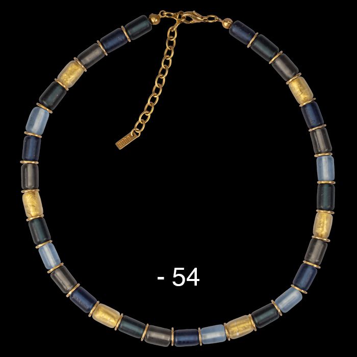 Collier mit einer wunderbaren Farbkombinationen aus blauen, grauen und goldenen Glaswalzen - in den goldenen Perlen ist echtes Blattgold verarbeitet - sowie kleinen vergoldeten Zwischenscheiben, Glasperlen 10x8 mm, Gesamtlänge 42 cm + 5 cm Verlängerungskettchen, 22 Karat matt vergoldet, anlaufgeschützt