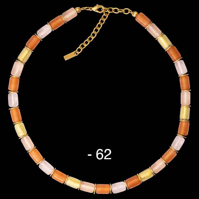 Collier mit einer wunderbaren Farbkombinationen aus goldenen, orangenen und rosafarbenden Glaswalzen - in den goldenen Perlen ist echtes Blattgold verarbeitet - sowie kleinen vergoldeten Zwischenscheiben, Glasperlen 10x8 mm, Gesamtlänge 42 cm + 5 cm Verlängerungskettchen, 22 Karat matt vergoldet, anlaufgeschützt