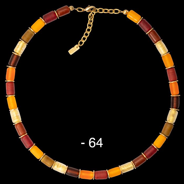 Collier mit einer wunderbaren Farbkombinationen aus roten, orangenen, braunen und goldenen Glaswalzen - in den goldenen Perlen ist echtes Blattgold verarbeitet - sowie kleinen vergoldeten Zwischenscheiben, Glasperlen 10x8 mm, Gesamtlänge 42 cm + 5 cm Verlängerungskettchen, 22 Karat matt vergoldet, anlaufgeschützt