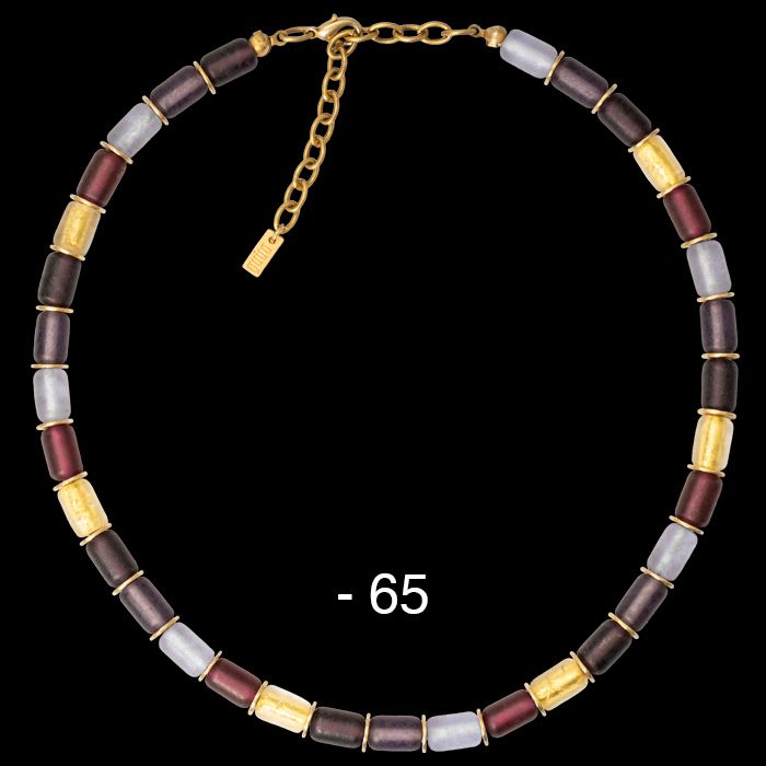 Collier mit einer wunderbaren Farbkombinationen aus verschiedenen violetten und goldenen Glaswalzen - in den goldenen Perlen ist echtes Blattgold verarbeitet - sowie kleinen vergoldeten Zwischenscheiben, Glasperlen 10x8 mm, Gesamtlänge 42 cm + 5 cm Verlängerungskettchen, 22 Karat matt vergoldet, anlaufgeschützt