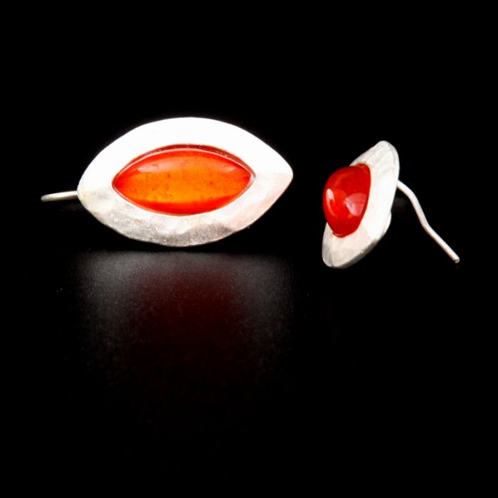 Ohrhaken Spitzoval, unregelmäßig gehämmerter Rand, mit leuchtendem Glasstein, Durchmesser gesamt ca. 28x14 mm, Glasstein 15x7 mm, matt versilbert oder 22 Karat matt vergoldet, anlaufgeschützt, mit kleiner Plastiksicherung für die Ohrhaken