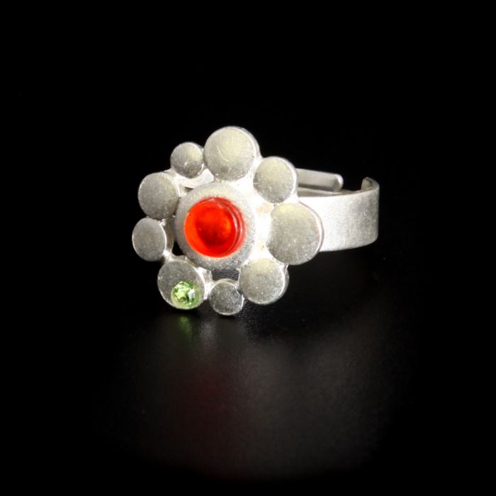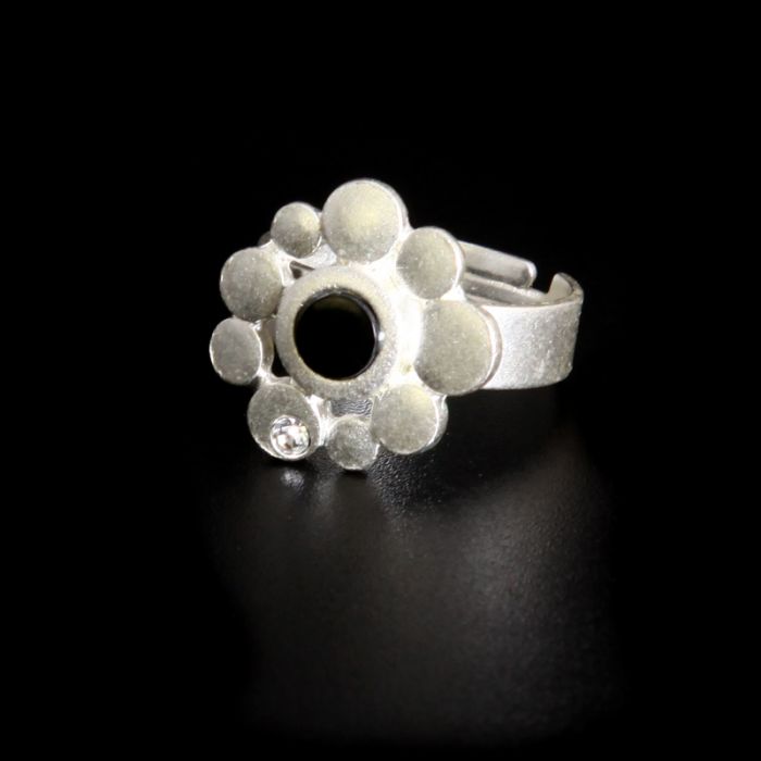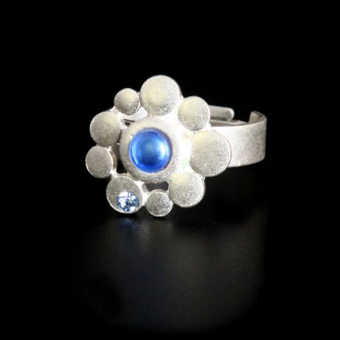 Runder Ring mit kleinen leuchtenden Glassteinen, Durchmesser Metallteil ca. 18 mm, Ringgröße variabel einstellbar, matt versilbert oder 22 Karat matt vergoldet, anlaufgeschützt