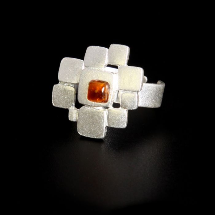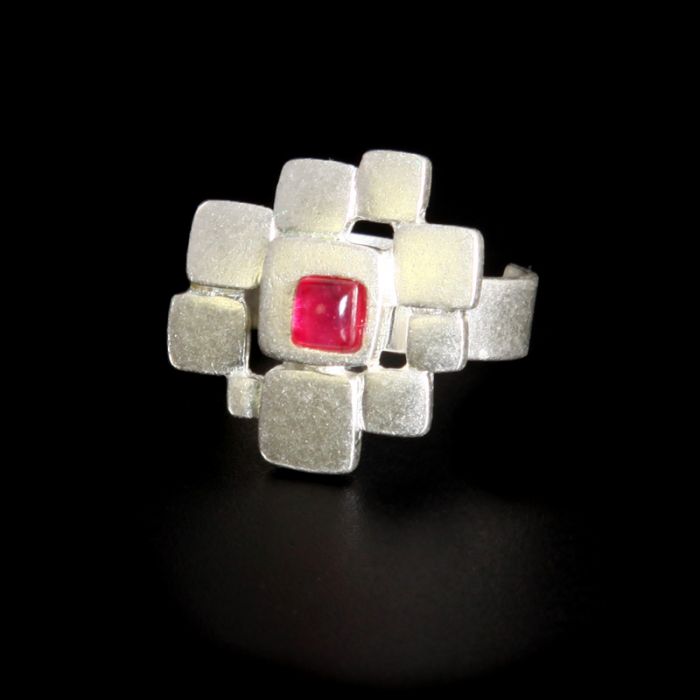 Eckiger Ring mit kleinem leuchtenden Glasstein, Durchmesser Metallteil ca. 20 mm, Ringgröße variabel einstellbar, matt versilbert oder 22 Karat matt vergoldet, anlaufgeschützt
